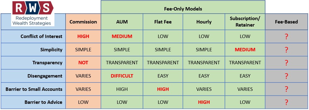 This article compares the various fee models now in use. It should help the reader form a basis for determining the total cost of the advice they are receiving. Fair warning, though – Sean and I are not disinterested bystanders in this discussion. We are active participants. We are running a business and we have individual financial goals just like everyone else. We could make a successful business with any of the fee models discussed. We did not choose the fee structure we use at RWS because we thought it was the best way to make money. We chose it because we believe deeply that it helps make us better advisers to the tribe we want to serve - military and veteran families. If I state that one aspect of a fee model is better or more important than another, it is often in the context of being better for our target audience of military and veteran families.